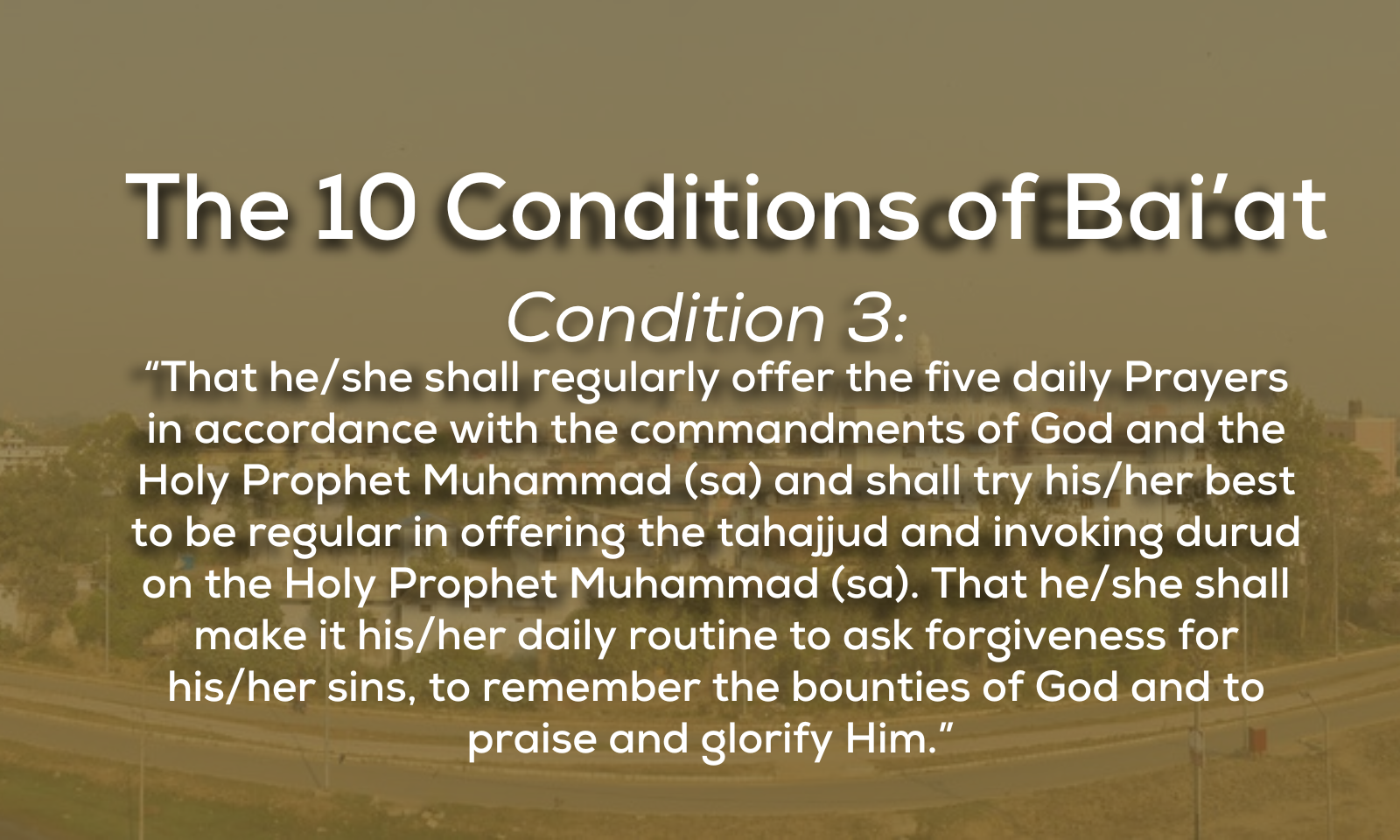 “That he/she shall regularly offer the five daily Prayers in accordance with the commandments of God and the Holy Prophet Muhammadsa and shall try his/her best to be regular in offering the tahajjud and invoking durud on the Holy Prophet Muhammadsa. That he/she shall make it his/her daily routine to ask forgiveness for his/her sins, to remember the bounties of God and to praise and glorify Him.”